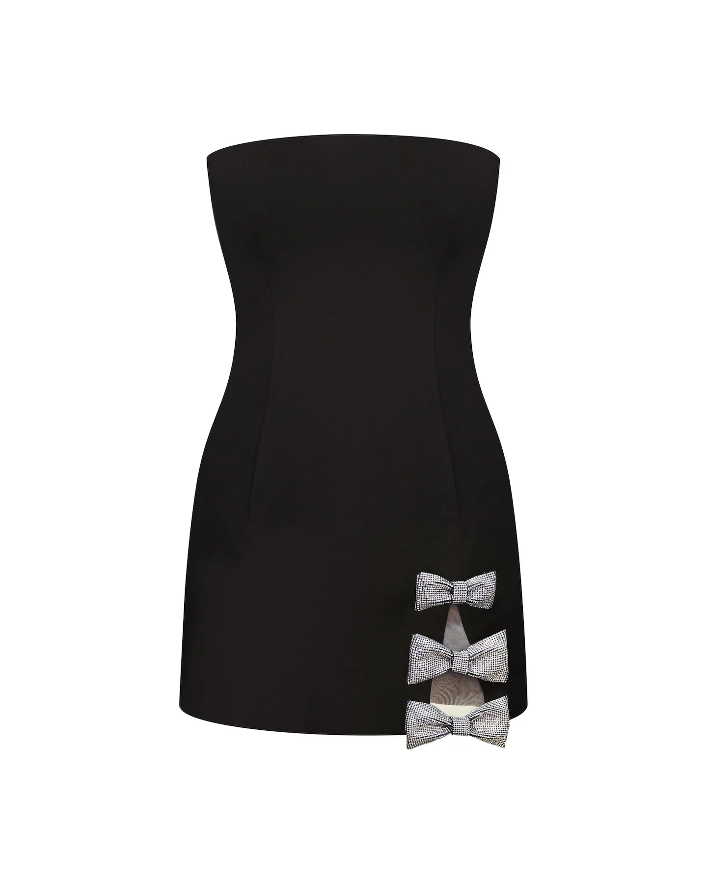 This classic little black dress is adorned with a row of bows at the hem for a charming touch.