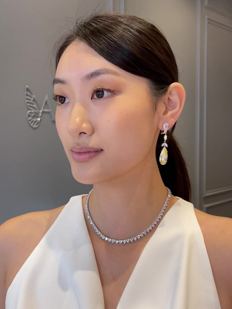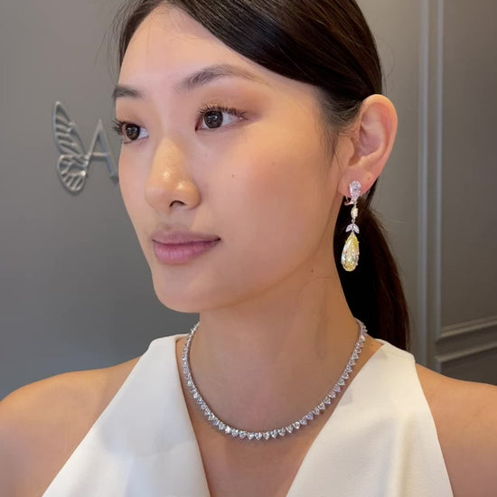 A classic pair of earrings in 18k white gold and rhodium vermeil , intricately hand set with 2 pear-shaped laboratory-grown simulated canary diamonds of 16cts each, 2 pear shaped white diamonds of 3.5cts each, 4 marquise diamonds of 0.4cts each, and 2 marquise canary diamonds of 0.8cts each.