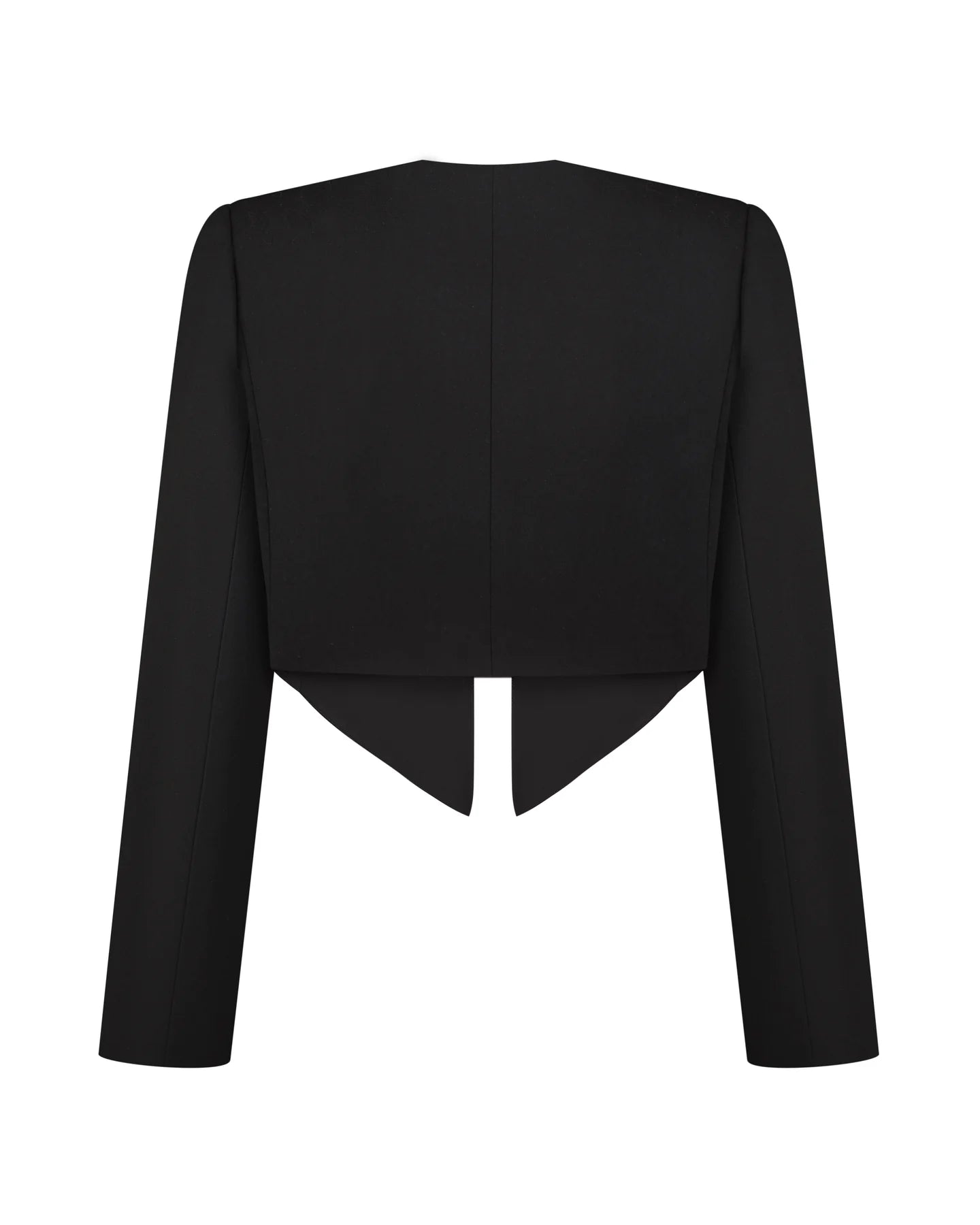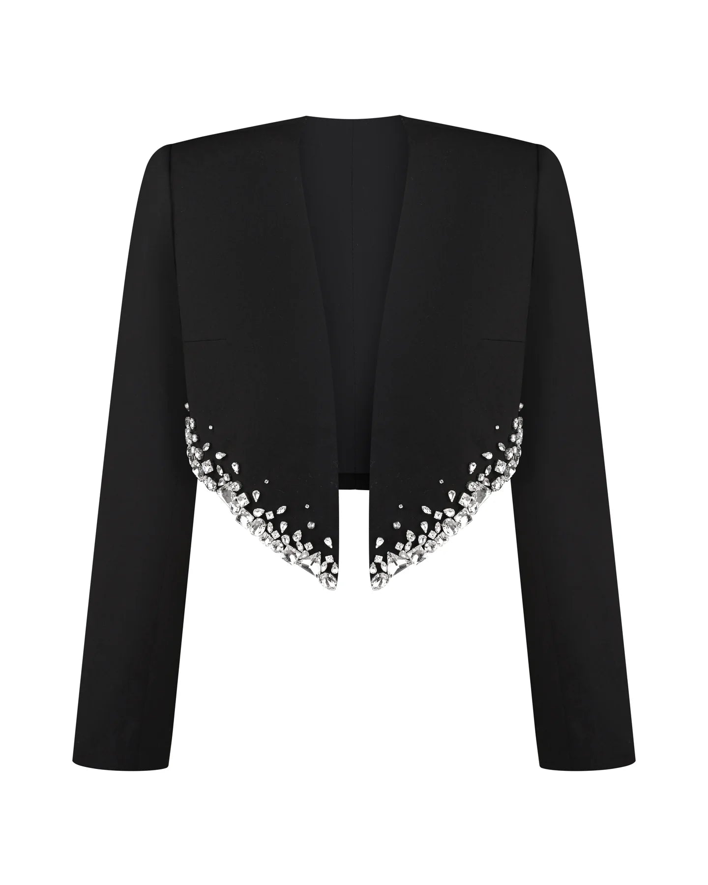 Make a bold statement with this high-impact cropped blazer, designed to exude style and confidence. The intricate crystal embellishments along the hemline create a dazzling effect, enhancing the minimalist silhouette. Pair it with a matching crystal-embellished skirt for a show-stopping look at any party.