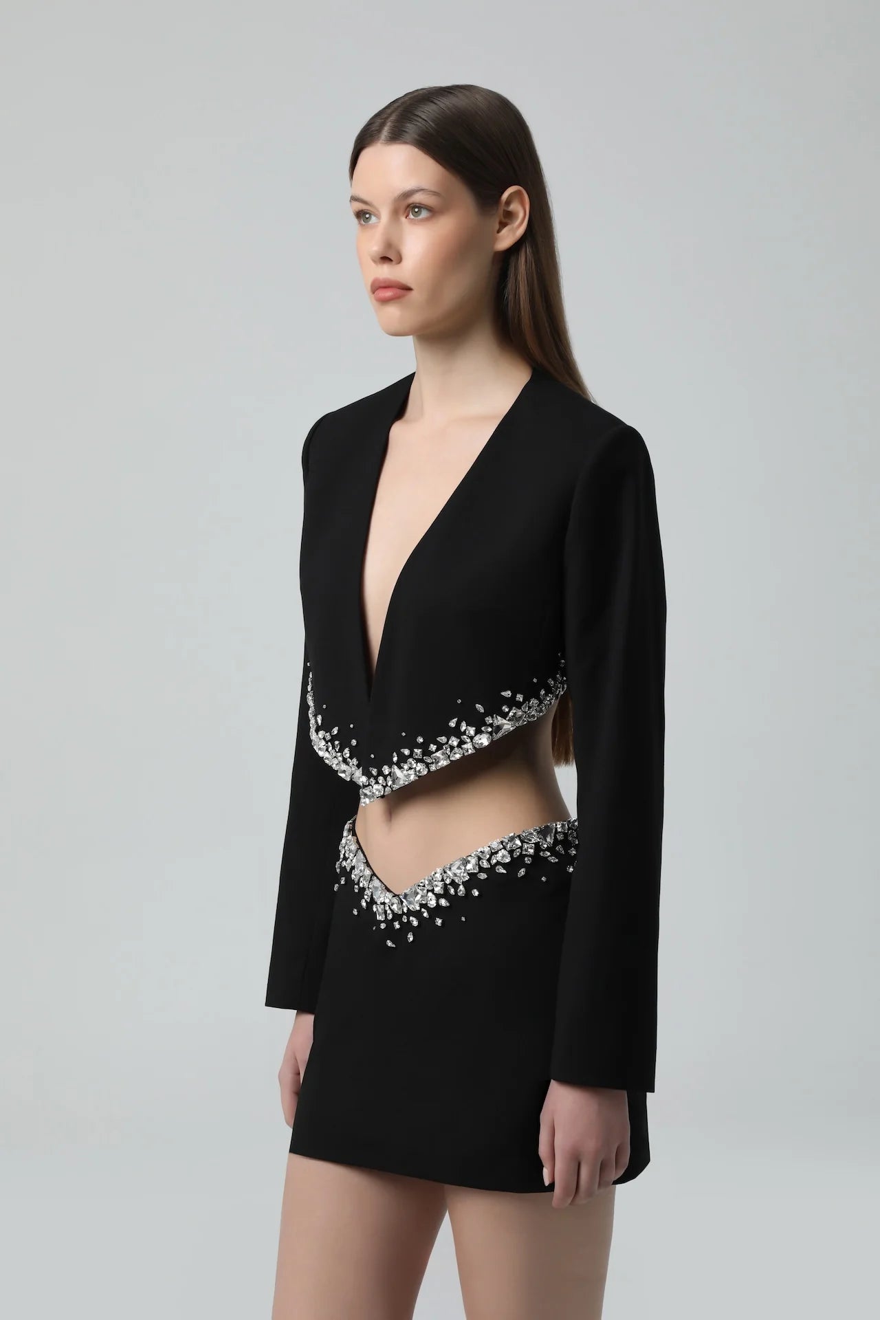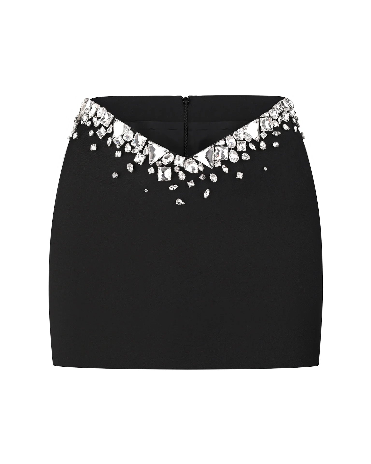 Make a statement in this black mini skirt that combines sleek minimalism with exquisite detailing along the waistline. Pair it with a matching blazer for a show-stopping look that will turn heads wherever you go.