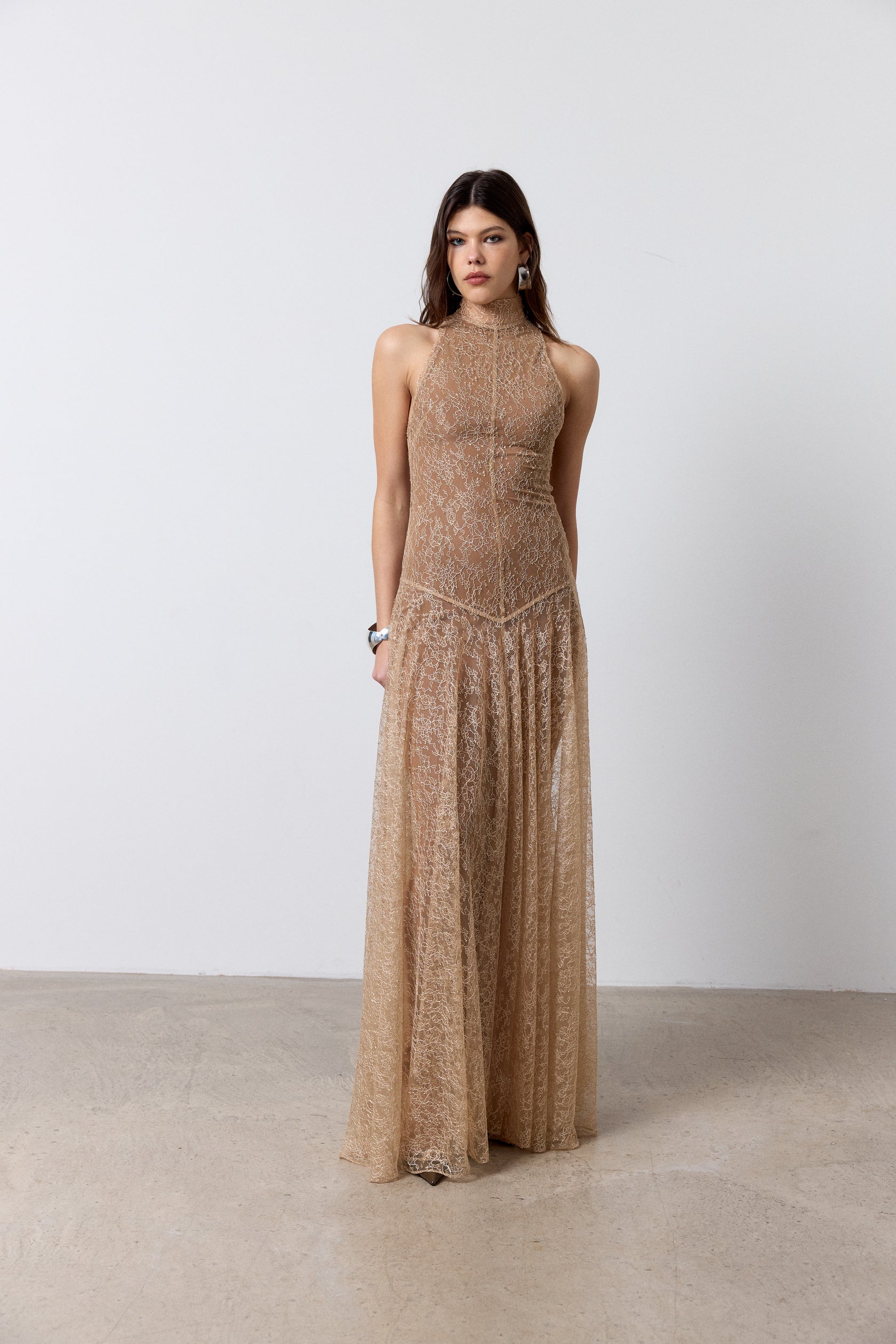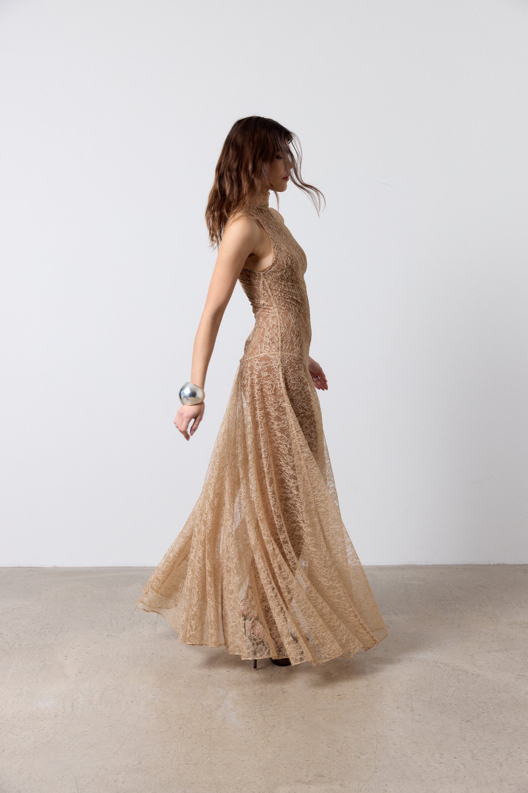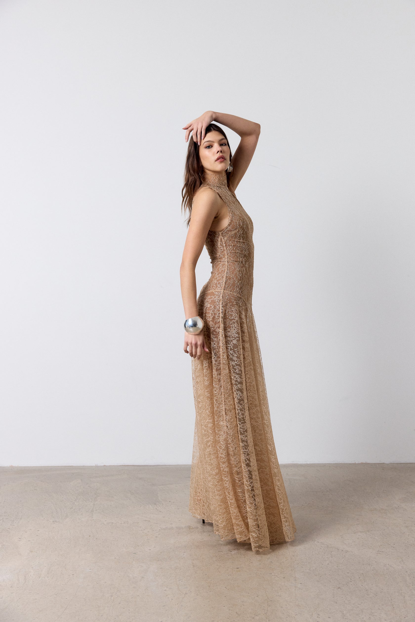 The Foehn Maxi Dress in lace showcases a high neckline and a full-circle skirt. It features a fitted bodice with a V-shaped dropped waist seam and a concealed center back for a sleek, elegant look.