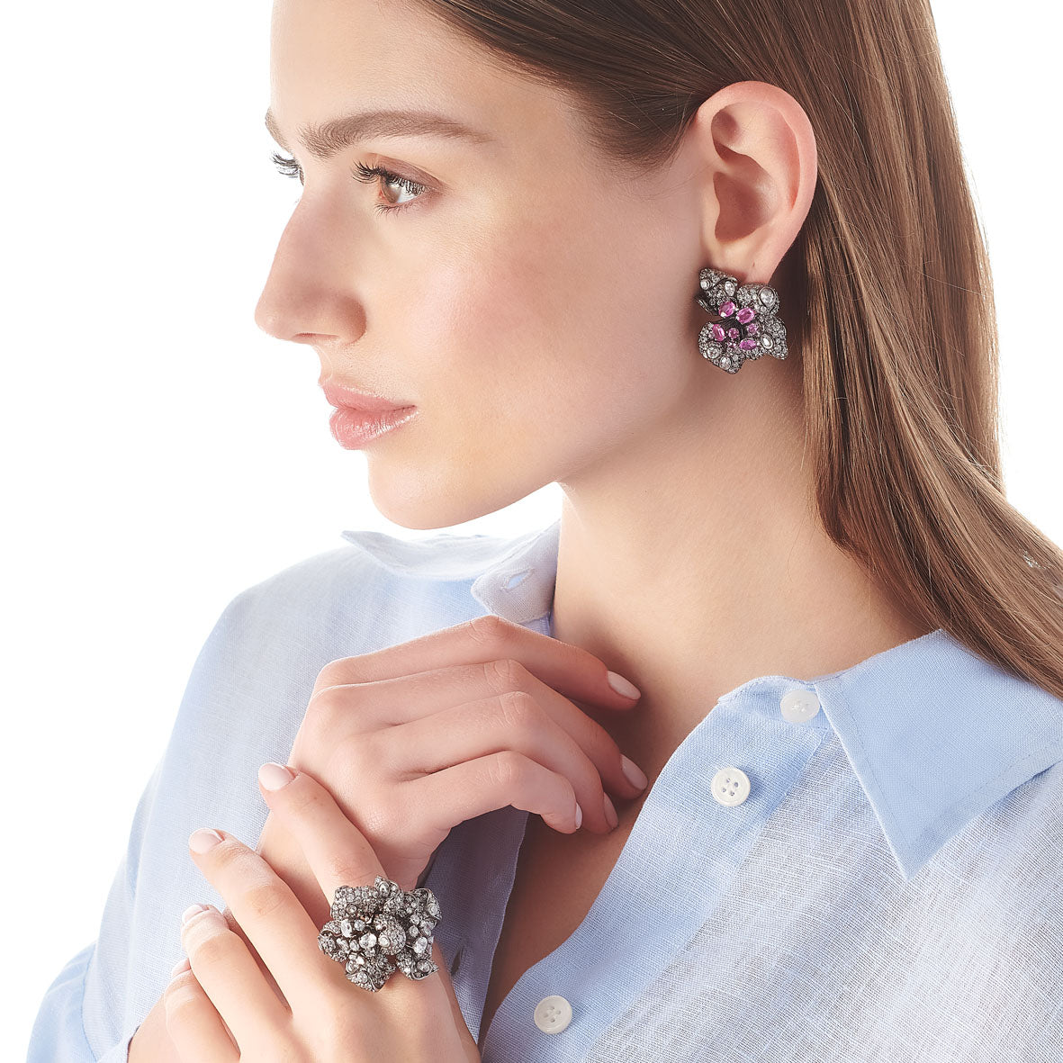 A stunning pair of earrings in 18k black gold and rhodium vermeil, with 14k gold earring posts and omega backs, intricately hand-set with 368 prong and pavé-set laboratory-grown and created gemstones including fuchsia sapphires and simulated white diamonds.