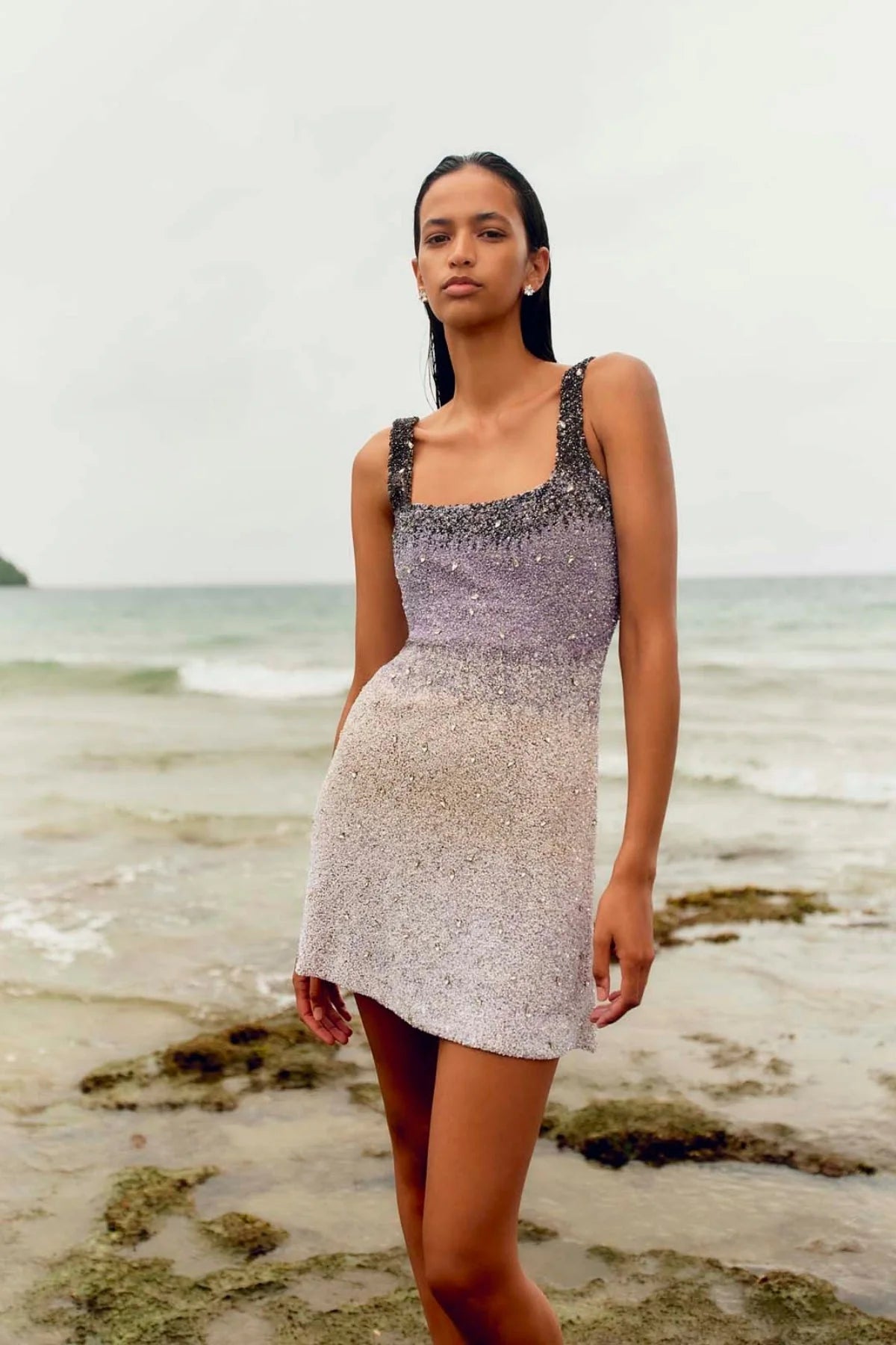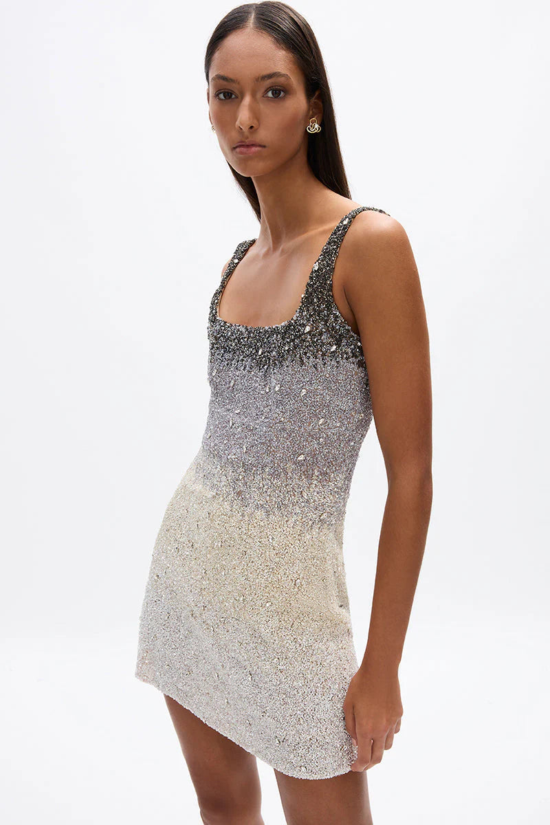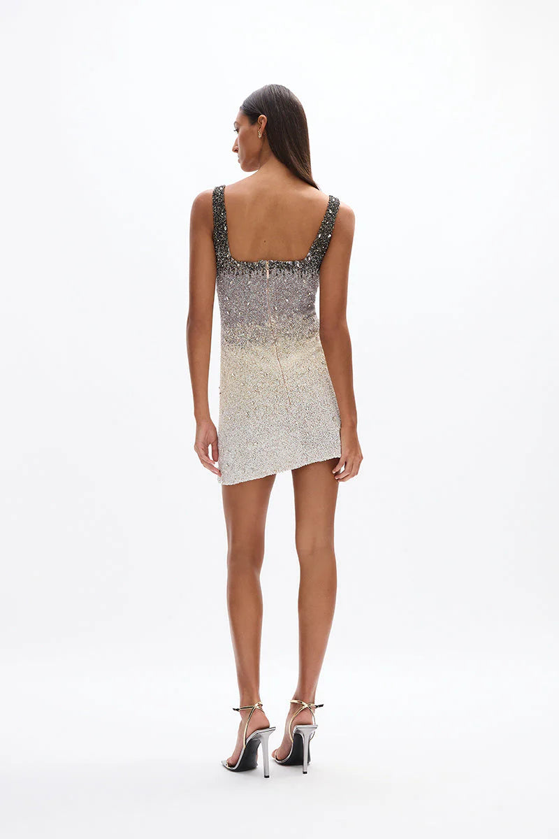 The Kaito Mini features all-over embellishment, each individually hand-sewn and placed to create wearable art. Adorned over a mini silhouette complete with internal corsetry and boning to form shape through the waist and falling to a subtle a-line skirt.
