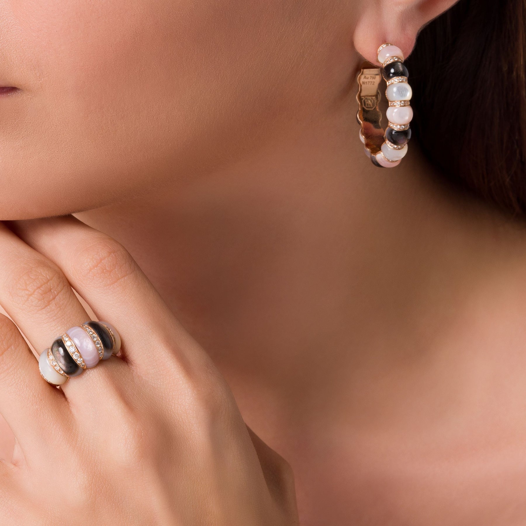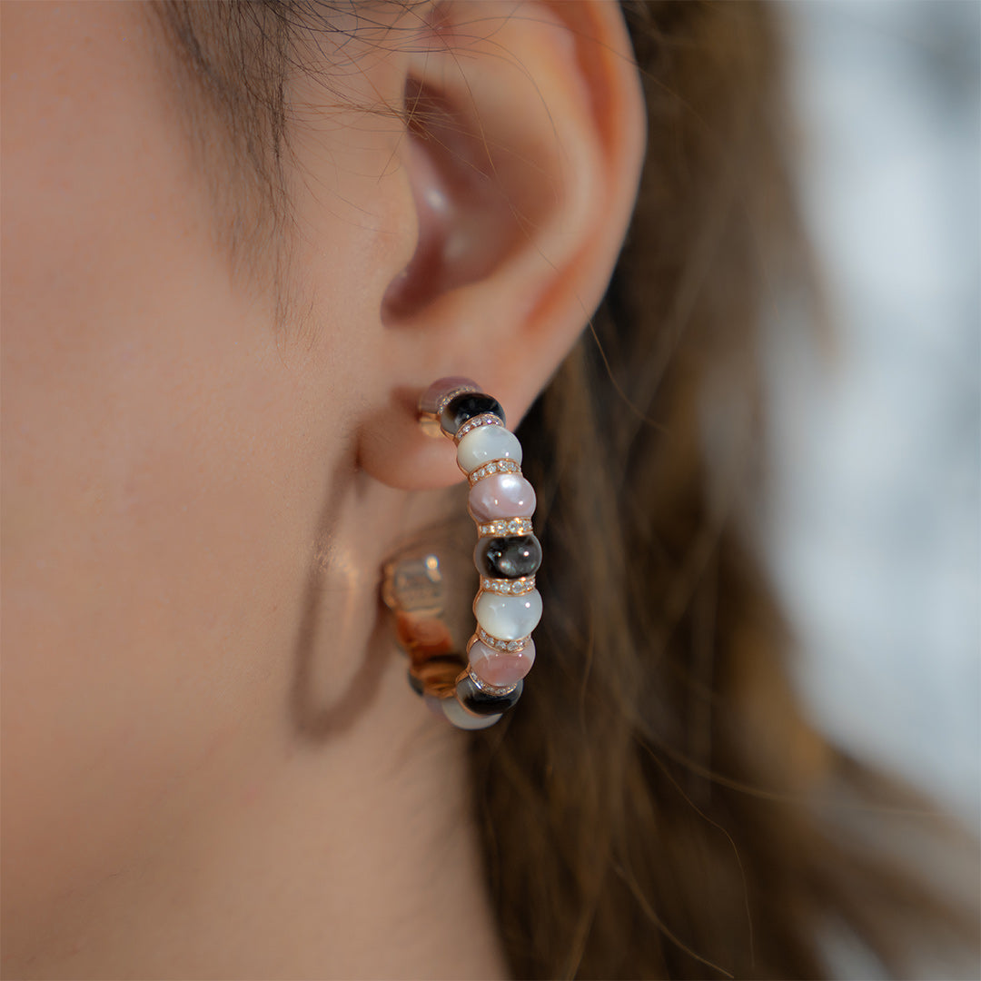 Elevate your ensemble with our Large Cerith Hoops. These sophisticated accessories showcase exquisite rose gold foundations adorned with delicate diamond accents and luminous hand-selected mother of pearl. Perfectly proportioned for making a refined statement, particularly during summer soirées, these hoops infuse any attire with an air of understated opulence and timeless elegance.