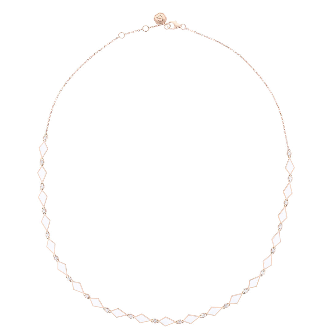 This refined mosaic necklace artfully combines delicacy with visual impact, presenting an exquisite accessory suitable for distinguished occasions. The meticulous arrangement of varied chromatic elements creates a composition of remarkable uniqueness. Versatility defines this piece—wear the vibrant mosaic facade for statement elegance, or rotate to reveal the pristine white reverse for understated sophistication. The thoughtfully designed 16-inch chain incorporates an adjustable closure, allowing for precise placement to harmonize with your ensemble's neckline.