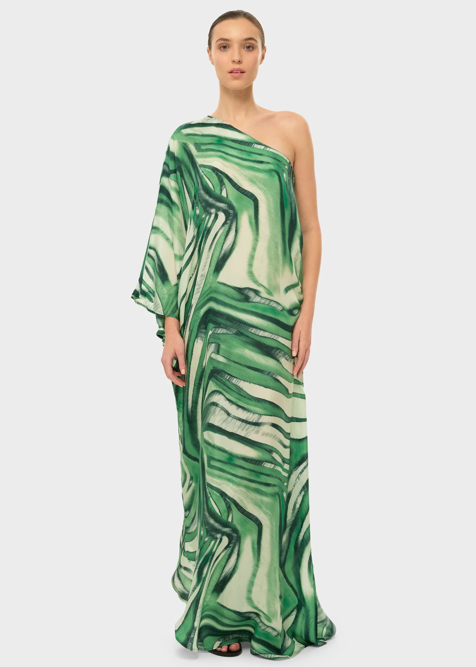 The AquaFlora One-Shoulder Dress offers a stunning blend of relaxed elegance and sustainable design, empowering you to embody your inner goddess. Featuring an asymmetric maxi silhouette, a single long raglan sleeve, and a slim leg opening, it exudes effortless sophistication.
