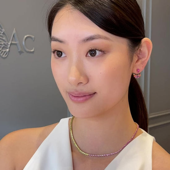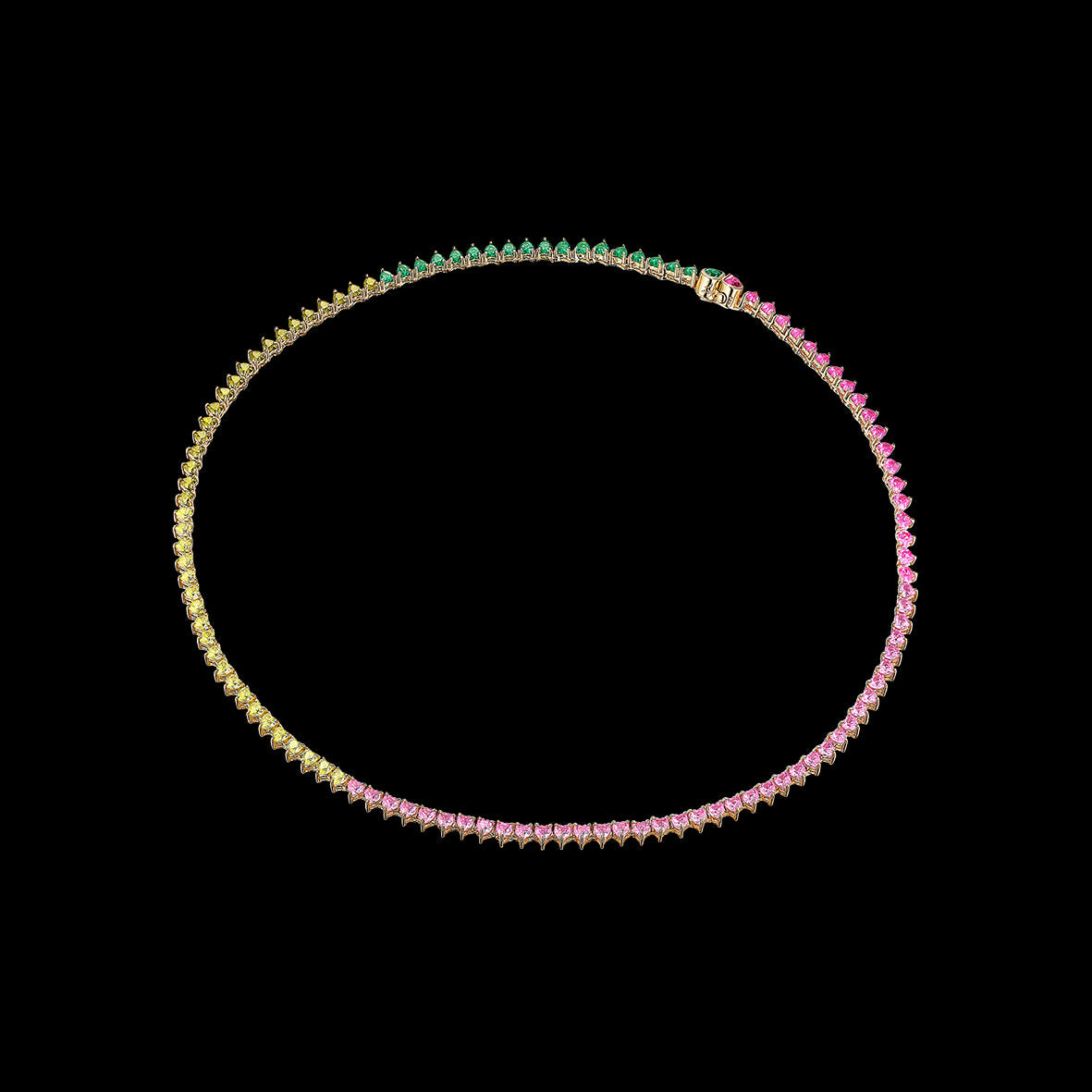 A timeless necklace in 18k yellow gold vermeil, intricately hand-set with 75 calibrated heart-cut laboratory-grown and created gemstones including emeralds, green tourmalines, lemon quartz, blush and fuchsia pink sapphires.